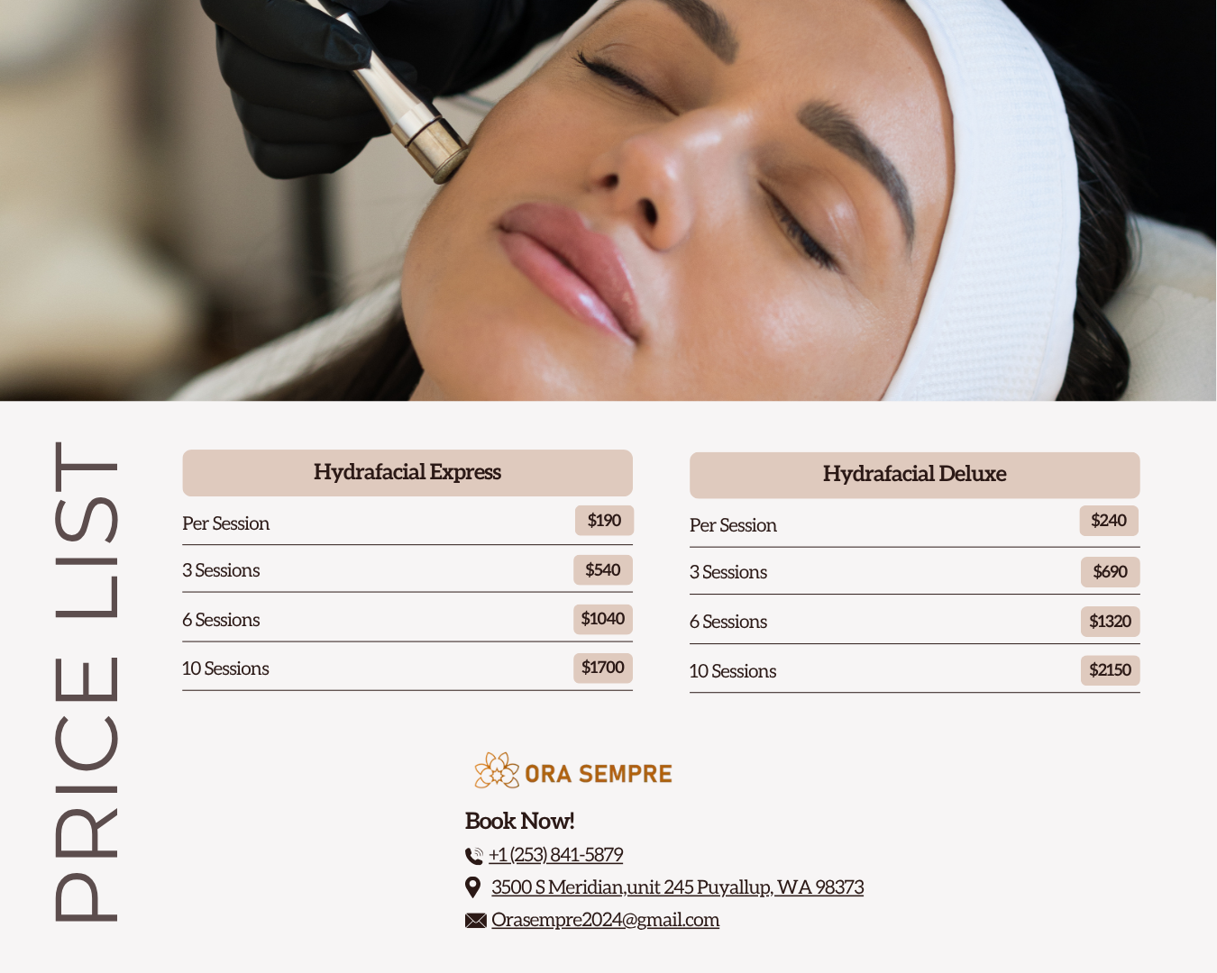 When your skin looks dull, congested, or tired, it’s time to give it the care it deserves. At Ora Sempre Spa, our HydraFacial is a revolutionary, non-invasive treatment that deeply cleanses, exfoliates, extracts impurities, and infuses skin with nourishing serums — leaving you with an instant, radiant glow.
